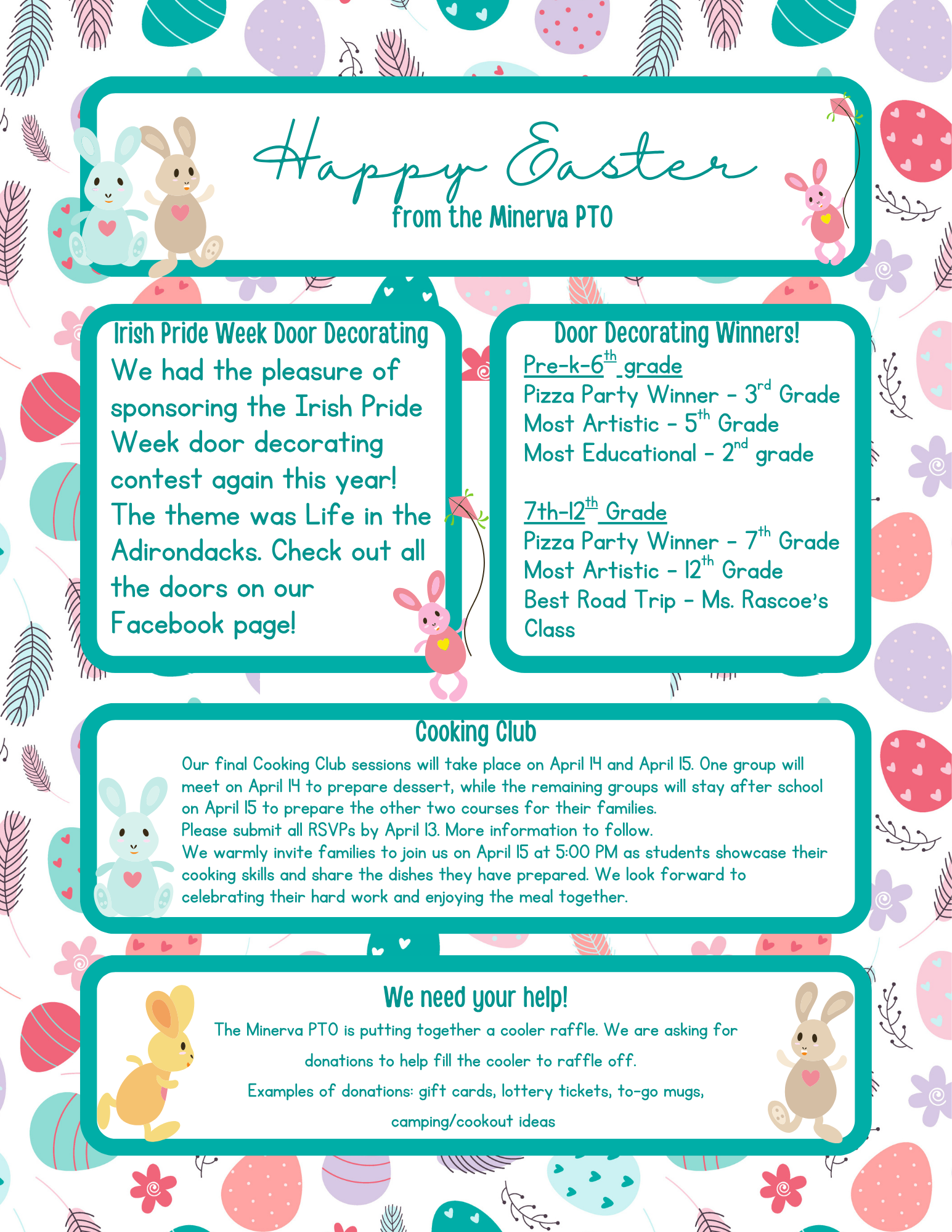 As you may have seen in the newsletter, the PTO is forming a Minerva Central School Community cookbook, and we are looking for your favorite recipes! We are asking students, faculty, staff, and alumni for submissions. Recipes can be sent to our email address or our mailbox at school!